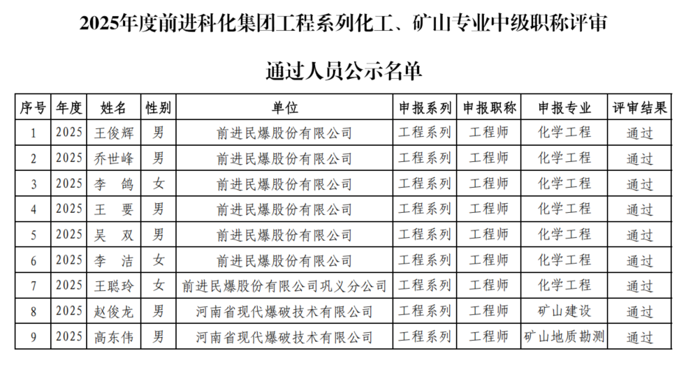 根據河南省前進化工科技集團股份有限公司(下稱“前進科化集團”)化工、礦山專業中級職稱評審工作安排,通過個人申報、單位推薦、主管部門和市人力資源社會保障部門資格審查,經前進科化集團工程系列化工、礦山專業中級職稱評審委員會評審,共有9名專業技術人員通過2025年度工程系列化工、礦山專業中級職稱評審。現將通過人員名單公示如下,請予監督。如對公示人員有問題反映,請于公示期內反饋至人事財務管理部。